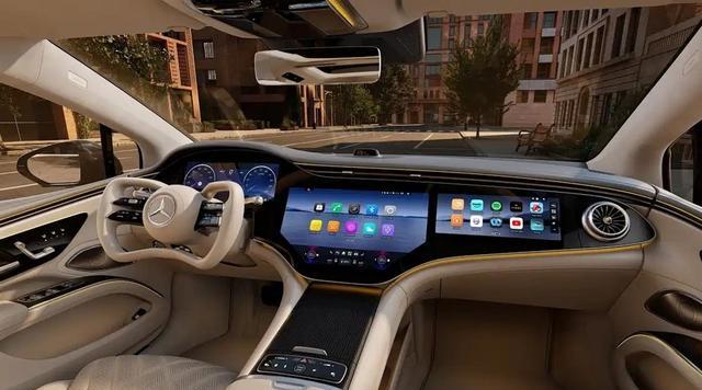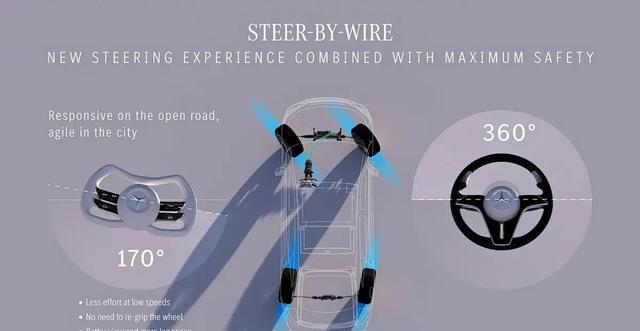 再看车内,新奔驰EQS引入了造型独特的半辐式方向盘,目的是在减少视线遮挡并方便进出,奔驰为此专门重新研发了安全气囊。与之配合的是线控转向技术,取消了机械连接,结合后轮转向,能过滤路面颠簸,也可以在低速时通过小幅度转动实现大角度转弯,大幅提升操控灵活性。车机系统方面,新车继续搭载55英寸的MBUX超联屏,内置最新的MB.OS系统,引入了AI虚拟形象和在线支付功能。