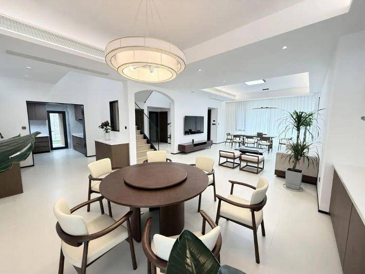 在位于余姚市河姆渡镇的浙江广天构件集团股份有限公司内,一幢占地170多平方米的二层小楼和周围厂房“画风”很不同:黄白色外墙、太阳能光伏屋顶,带露天阳台和精致小院。屋内简约现代,整面落地窗让客厅通透明亮,茶台、沙发、智能家居等一应俱全。这是当地首套“全装配式”农房样板房。